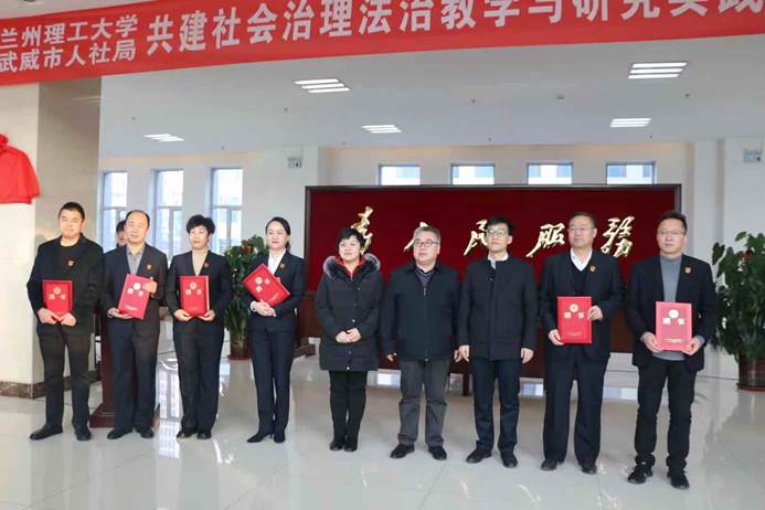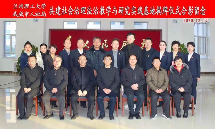 2020年12月17日,兰州理工大学与武威市人力资源和社会保障局共建“社会治理法治教学与研究实践基地”签约与揭牌仪式在武威市人社大厦举行。武威市人力资源和社会保障局党组书记、局长陈昱川,武威市司法局副局长胡兆勇,武威市人力资源和社会保障局副局长王晨明、宿万鹏,武威市劳动人事争议仲裁院院长刘玉萍及县区仲裁人员,兰州理工大学法学院院长贾小龙,副院长白小平,法律硕士教育中心主任原新利博士及研究生代表参加了仪式。