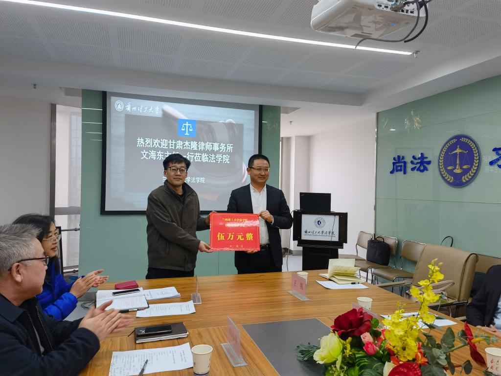 2021年1月7日下午,“杰隆律师奖学金”年度注资仪式暨《民法典》实施座谈会在法学院会议室举行。甘肃杰隆律师事务所主任文海东律师、管理合伙人翟丽霞女士,法学院领导班子、学院系部中心负责人、教师及研究生代表参加了活动。注资仪式及座谈会由白小平副院长主持。