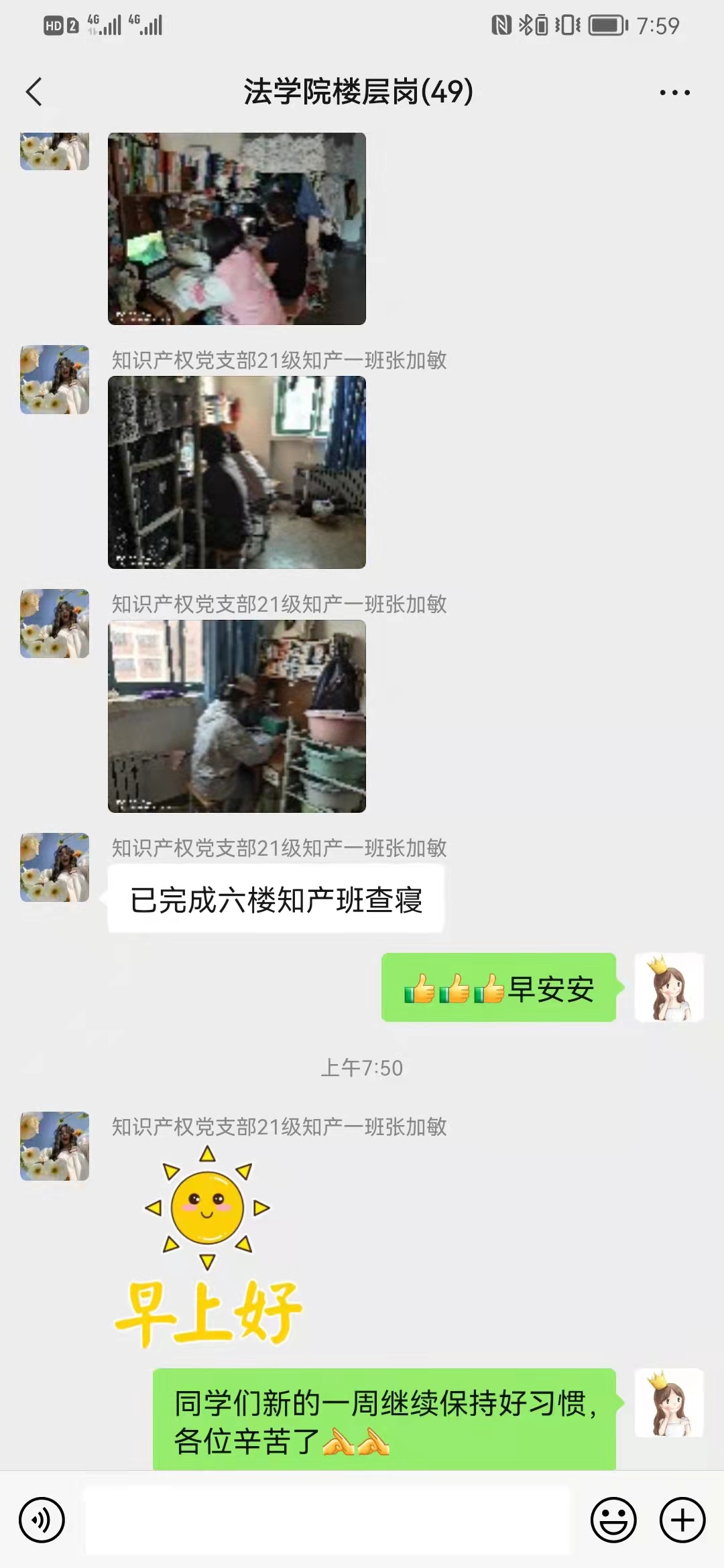 法学院党委“闻令而动、听令而行”,按照甘肃省、省教育厅、属地和学校关于做好疫情防控工作的要求,始终把师生的生命安全和身体健康放在首位。把疫情防控工作作为当前压倒一切的政治任务,结合工作实际,全面加强学院闭环管理。分层分类及时召开疫情防控工作会议,迅速安排、行动有力、推进有序,根据学校疫情防控工作领导小组指挥全程发力。学院院长、院党委书记第一时间入校确保各项工作落实到位,严格执行平安校园管理要求,线下每天带队深入学生宿舍慰问看望学生,关怀了解学生需求,加强心理思想关注,聚焦学习生活等关键点位,及时为同学们排忧解难;深入检测现场,确保在校生全员核酸检测;及时通报情况,普及科学防疫知识、逐一讲解要求,获取相互守护的正确理解。学院班子线上线下根据工作分工确保学院各项工作正常推进,及时答疑解惑关注关心教师诉求,切实保障疫情防控期间的安全与稳定。各教师党支部书记根据预案带领全体教职工党员开展“一帮一”联系居家隔离教师,走读学生,提供日常生活帮助,做好科学防疫指导。全体教师认真开展线上教学,加强对学生课堂过程的管理,课后联系学生开展学业指导。综合办、学生办、教学办协调有序全面做好教学、学习保障,加强联动,沟通解决存在问题。各学生党支部按照学院闭环管理要求,加强网格化管理每日落实情况的提醒、引导、交流。辅导员带领全体学生干部、志愿者在学院指导下配合每日健康上报、早学业预警、晚半小时预警、心理晴雨关注、宿舍通风、垃圾下楼、分流组织......“守土有责、守土尽责”,全院上下一盘棋、师生一条心,严防严守阵地,众志成城构筑起了有力的校园安全防线。