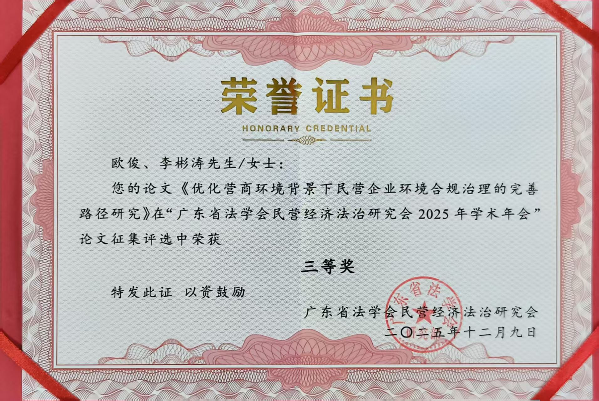 2025年12月9日,由广东省法学会民营经济法治研究会主办,广州商学院承办的广东省法学会民营经济法治研究会2025年学术年会,在广州商学院举行,来自理论与实务部门的200余人参会,法学院硕士研究生李彬涛应邀参会,其提交的论文获得优秀论文三等奖。