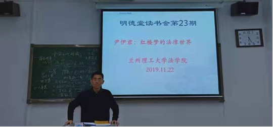 兰州理工大学法学院研究生“明德堂读书会”第二十三期于2019年11月22日下午在抒望楼102教室举行。本次读书会从中国法制史的角度来研读尹伊君著的《红楼梦的法律世界》一书。