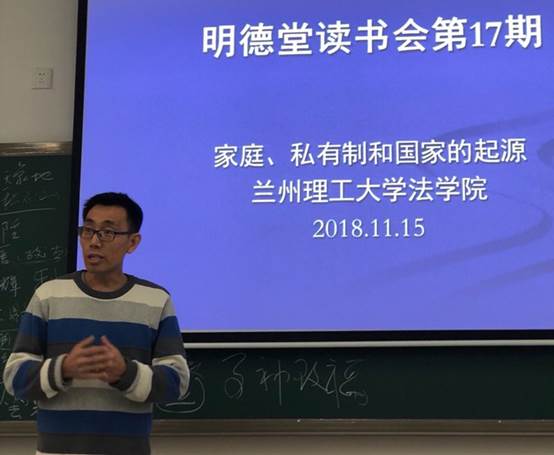 2018年11月15日下午,明德堂读书会第17期在4号教学楼102教室成功举行。窗外大雪纷飞,室内温暖如春。穆永强老师主持了本期读书会,本期读书会研读弗里德里希·恩格斯的《家庭、私有制和国家的起源》。该书是一部关于古代社会发展规律和国家起源的著作,是马克思主义国家学说代表作之一。