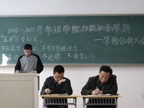 为了创建优良学风,克服大学生在生活、学习中的种种陋习,学院倡议在全院开展“五不”承诺倡议活动。本次大会上,2012级法学全体同学进行了以“不带手机进课堂,不带早餐进教室,不逃课,不校外住宿,不通宵上网”为内容的“五不”承诺宣誓活动。