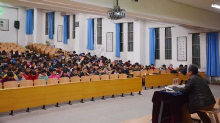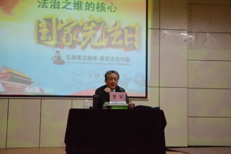 在主持人简短介绍了中国国家宪法日设立过程以及重大意义之后,贾军教授主要从四个方面向在场学生和老师解读了全面推进依法治国、法治中国建设的目的及核心等重大理论和现实问题。讲座历时两个多小时,精彩不断,内容丰富,信息量很大。既有深厚而凝练的历史回顾,又充满着解放思想的时代精神;既有对源远流长、别具一格的中华法系鲜明特点的回顾,对新中国依法治国方略确定的过程、意义的清晰概括,又有对全面推进依法治国决定的深刻解读。讲座的鲜明主题是:坚持依法治国首先要坚持依宪治国,坚持依法执政首先要坚持依宪执政;全面推进依法治国进程,是大力推进经济体制和政治体制改革的基本前提和重要保障,也是维护国家长治久安的根本保障。