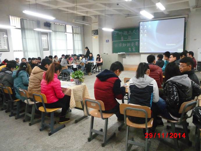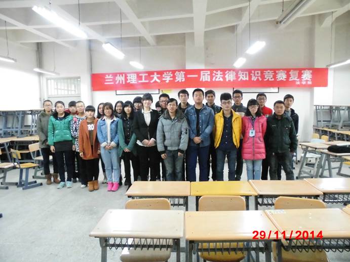 2014年11月29日,兰州理工大学第一届“法情法理·法随我行”法律法律知识竞赛复赛成功举行。法学院辅导员吕老师、学生会主席王有、国奖获得者刘凡圆、能动学院学生会副主席黄丹担任评委。法学院组织部部长韩非,外宣部副部长何彩龄主持本次复赛。