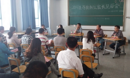 为帮助新生及家长更好地了解法学院,增进学院与家长间的联系和沟通,法学院按照学校的统一安排,于2014年9月4日下午四点在西校区召开了新生家长见面会。法学院吕志祥副院长、贾军副院长、院长助理贾小龙老师、知识产权系主任乔煜老师、辅导员魏虹老师与新生家长们进行了座谈交流。