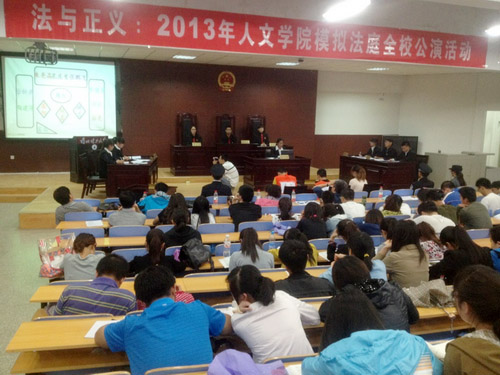 7月9日晚7点,学院在西校区1号楼108教室举办了模拟法庭全校公演活动。副院长杨莉教授、法学系副主任穆永强博士等约计300多名师生参加了此次公演。