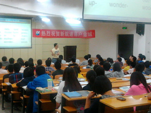 在白铁军博士的带领下现场气氛格外活跃。他分别从“声音是语言的灵魂,听力是其他能力的基础,语言的三大构件,词汇的重要性-词感,语法要变为语感,水桶理论,学习英语的正确方法和学习英语的五大误区”等方面重点讲述了如何学好英语以及学习英语的要领。期间通过各种游戏激发了学生们学习英语的兴趣。同时,还有针对性地通过自身的经历阐述了法学学生以及工科学子学好英语的诀窍。