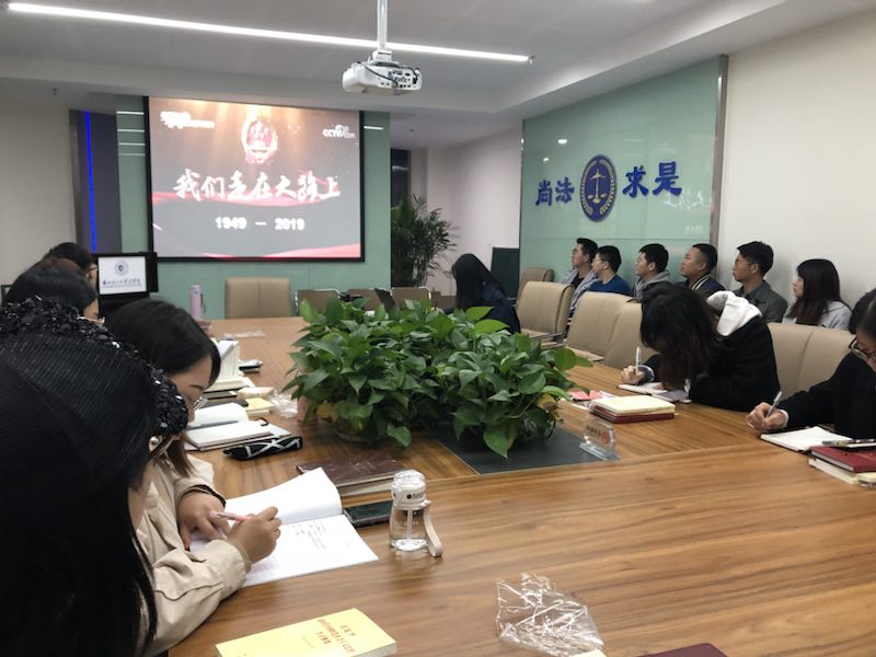 为深入学习贯彻习近平新时代中国特色社会主义思想,隆重庆祝中华人民共和国成立七十周年,大力弘扬爱国主义精神,进一步增强党员群众爱国爱校的真挚情感和不忘初心、牢记使命的奋斗精神。2019年10月16日19时,法学院研究生党支部于法学院会议室开展“庆祝新中国成立七十周年”主题党日活动。本次活动由支部副书记马菊萍同志主持,支部全体学生党员参加。